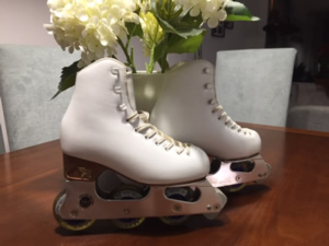 Patines en línea de 4 ruedas de patinaje Artístico. Bota modelo Edea Esordio, talla 270. Tienen unos 3 meses de uso. Su precio original es de 285 euros.